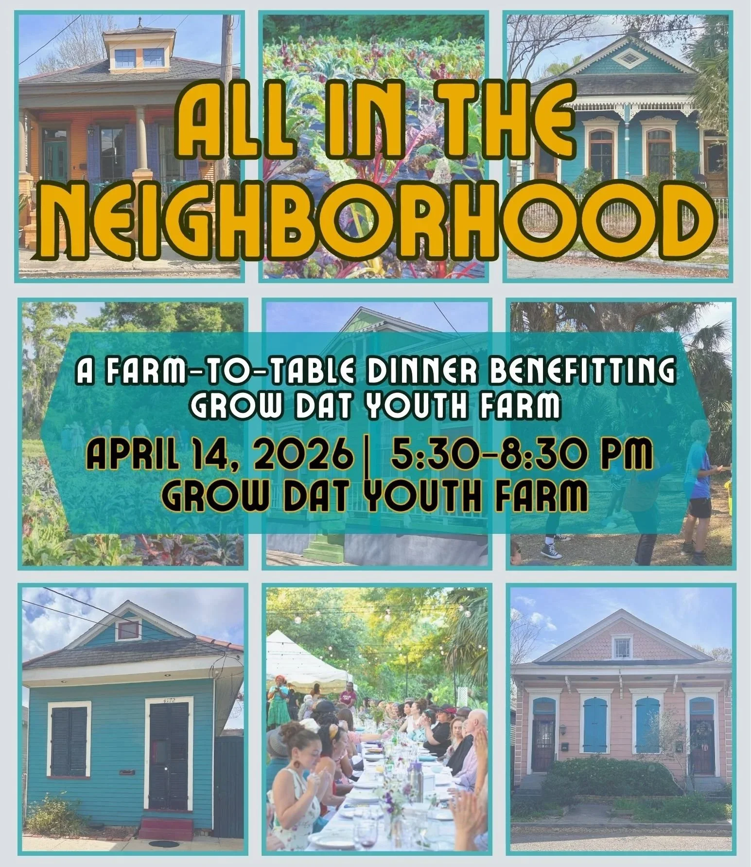 Tickets are on sale NOW for Grow Dat's annual Spring Farm Dinner! This year, we are celebrating our New Orleans community and all the inspiring ways we have seen our neighbors showing up for each other! At Grow Dat, we know that building a more just and sustainable world is a group project. Recently, we have witnessed an incredible demonstration of neighbors in New Orleans, and across this country caring for each other out loud. From delivering groceries to vulnerable families to meeting in solidarity at Congo Square, these activations were built on the base of thousands of smaller moments of love and care. In this spirit, we invite you to our long table under the Big Oak, to share in a farm-fresh meal and to create more of these small, meaningful moments together, in hopes that we use them as building blocks to a brighter future. To save your seat, click here!